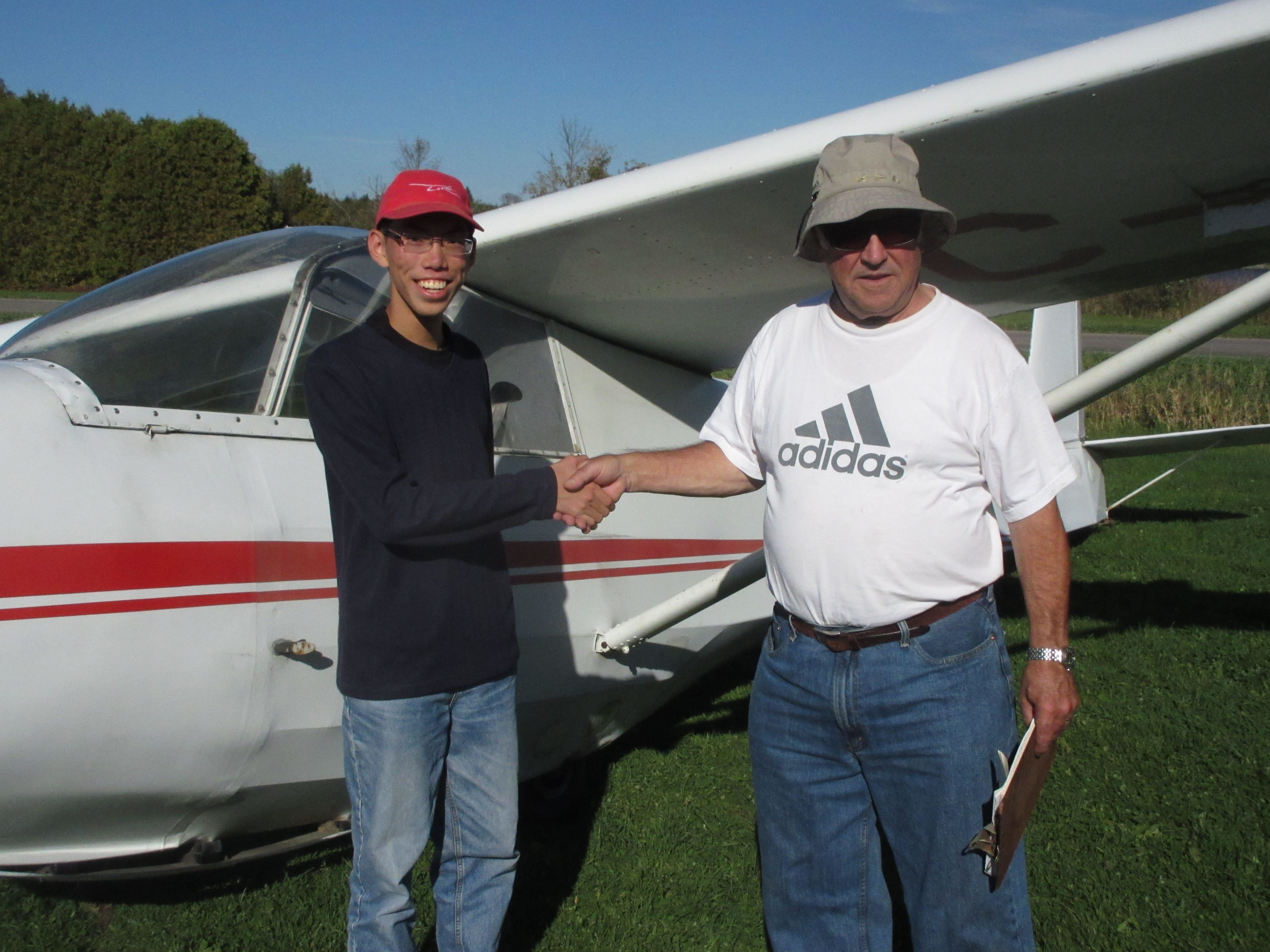 John Mitchell is seen congratulatingAaron Tan after his successful flight test. (12Oct15)