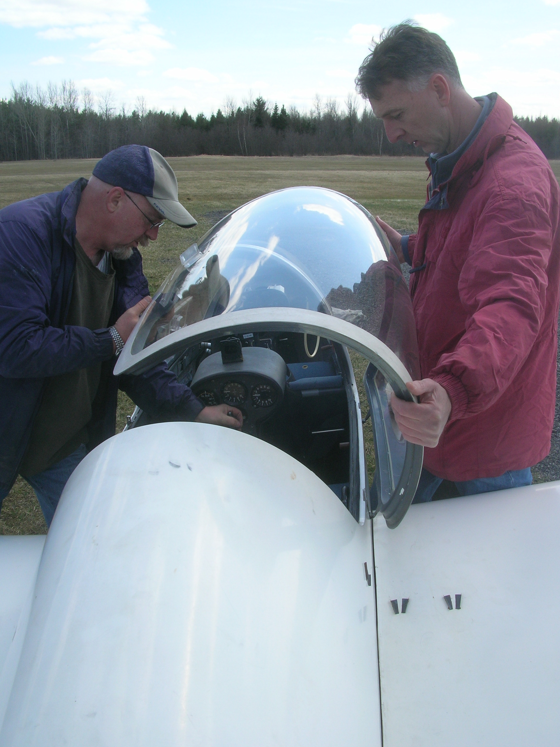 Neil Duffee (left) and Tim Forbes (right) prepare to install canopy on the Grob. (22Apr11)