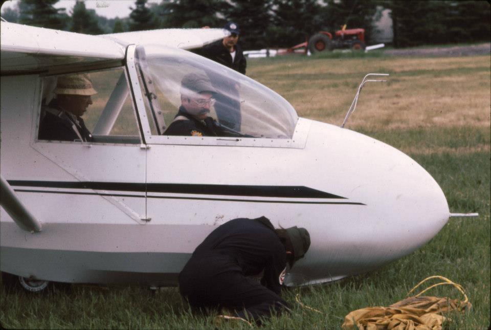 Steve Lazuk is seen holding the port wing. Peter Addison (Cadet CFI) is in rear seat and Bob Little in front. Jake Labonte is attaching cable.